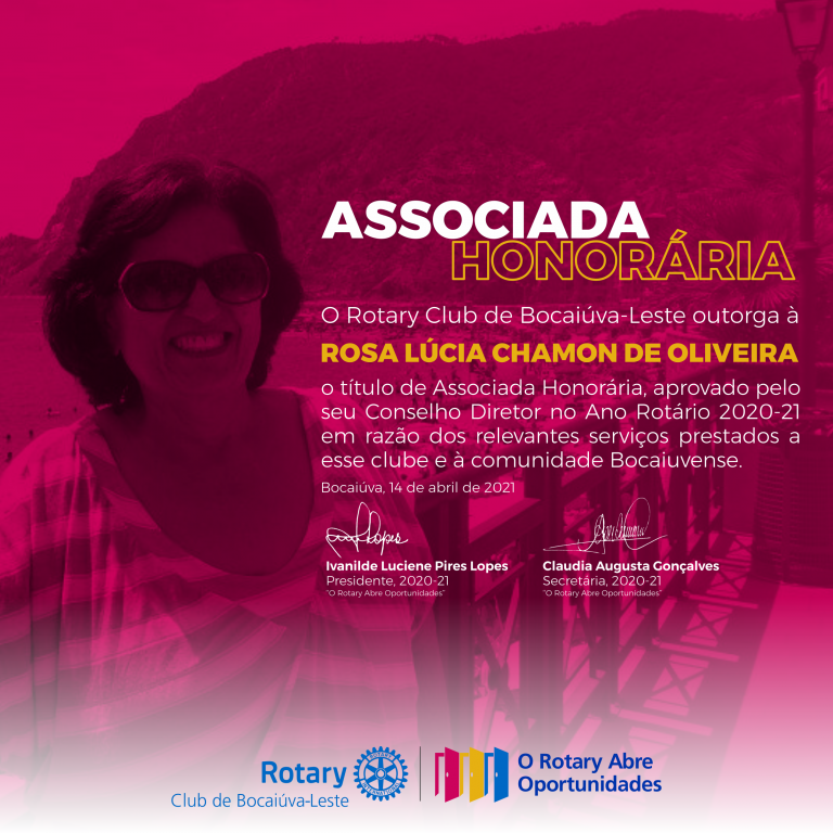 Em 2019, Rosa afastou-se fisicamente do Rotary por motivos de força maior e agora, em agradecimento por tudo que fez por este, é homenageada com com o título de Associada Honorária.