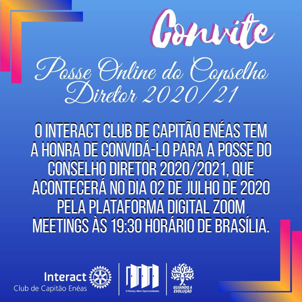 O Interact Club de Capitão Enéas tem a honra de convidá-los para a Posse do Conselho diretor 2020/2021, que acontecerá no dia 02/07/2020 Na plataforma digital de reuniões Zoom.