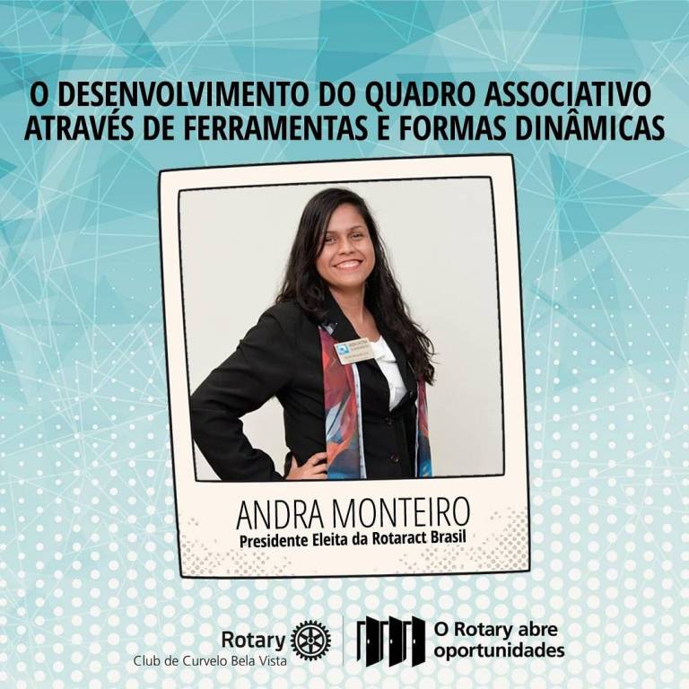 Na última quinta-feira, dia 27 de agosto de 2020, o Rotary Club de Curvelo Bela Vista recebeu a vista da companheira Andra Cristina Monteiro, do Rotaract Club de Jataí, Distrito 4770 e Presidente Eleita da MDIO Rotaract Brasil 2021-22 que proferiu a palestra "O Desenvolvimento do Quadro Associativo Através de Ferramentas e Formas Dinâmicas" em razão do mês de enfoque ao Desenvolvimento do Quadro Associativo, de acordo com o calendário rotário.