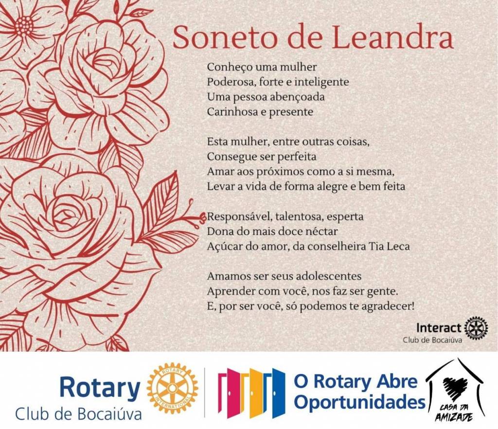 Quero que vocês saibam que o Interact não é apenas um clube ao qual você se associa. Ele é um convite a infinitas oportunidades. “Ele abre oportunidades para servir, seja em um projeto tão grande e histórico como a erradicação da pólio, quanto em pequenas ações comunitárias, onde você apenas planta uma árvore”.